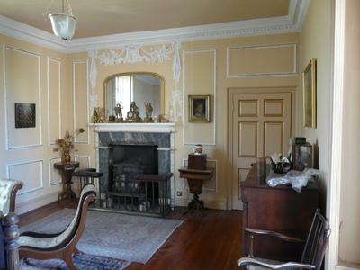 ornate plasterwork on walls and around fireplace
